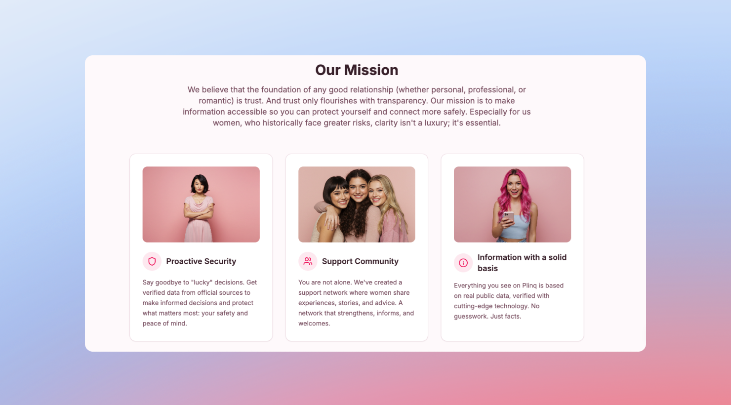 • Why it matters: Preventing real-world harm and femicide. To date, Plinq has helped women avoid 200+ potentially dangerous situations.